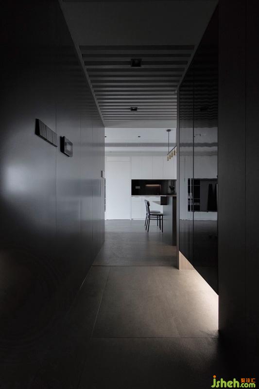 玄關(guān)處,左邊的墻面用了大面積的灰色不銹鋼作為修飾,沒有過多的裝飾使得視覺上更干凈。右邊鞋柜不到底的設(shè)計(jì),除了方便業(yè)主穿換鞋子,暗藏的光源更能營(yíng)造出舒適放松的氛圍。天花部分使用了商業(yè)空間中常見的鋁質(zhì)條形天花,材料的創(chuàng)意使用無(wú)形中增加了家居的趣味性。