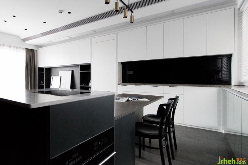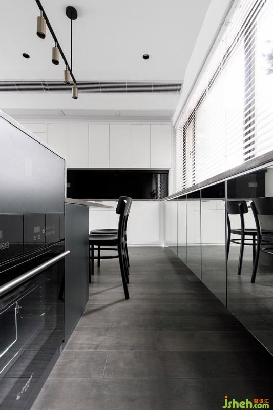餐廳有著寬闊靈動(dòng)的環(huán)形動(dòng)線。中島臺(tái)設(shè)置了烤箱和電磁爐,方便女業(yè)主進(jìn)行簡(jiǎn)單的煮食和制作糕點(diǎn),這無(wú)形中也延伸了廚房的區(qū)域。墻面上,從靠近玄關(guān)并與其呼應(yīng)的深色木面柜體、到窗戶下明亮的鏡面柜體、再到與電視墻一體成形的白色柜體,三者提供了非常充足的收納空間,各自的材質(zhì)使用分工明確而又能自然地過渡。