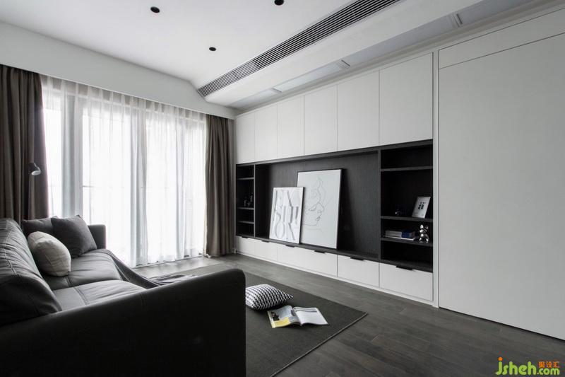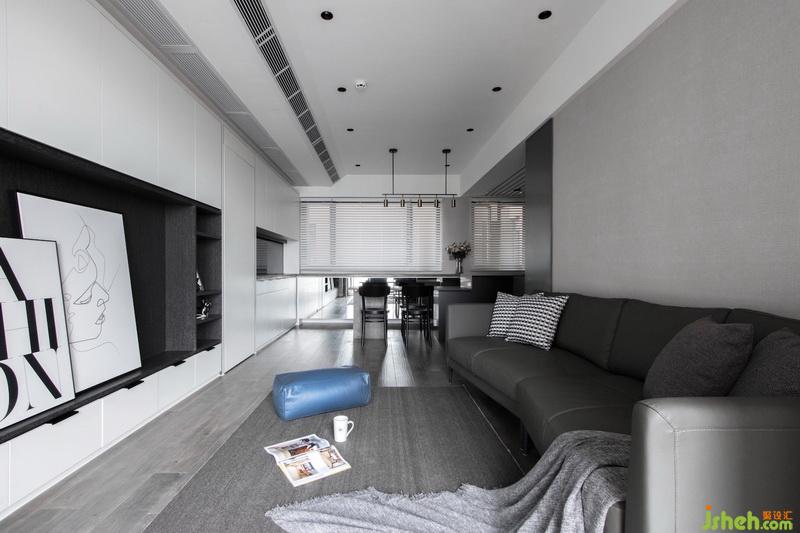簡(jiǎn)潔干凈的黑白灰,是整個(gè)空間的主色調(diào),符合業(yè)主簡(jiǎn)約風(fēng)格的設(shè)計(jì)需求和簡(jiǎn)單舒適的生活態(tài)度。電視高柜與天花之間留空,設(shè)置了間接性光源。天花機(jī)風(fēng)口以斜面形式呈現(xiàn),形成梯形天花,這樣的處理顯得天花不那么呆板,也能保證天花高度,減少壓抑感。從客廳、餐廳、一直到房間地面,都是使用木地板,更添舒適放松的感覺??臻g結(jié)構(gòu)線條帶來(lái)的延伸感,似乎意味著生活會(huì)有更多的想象和可能性。