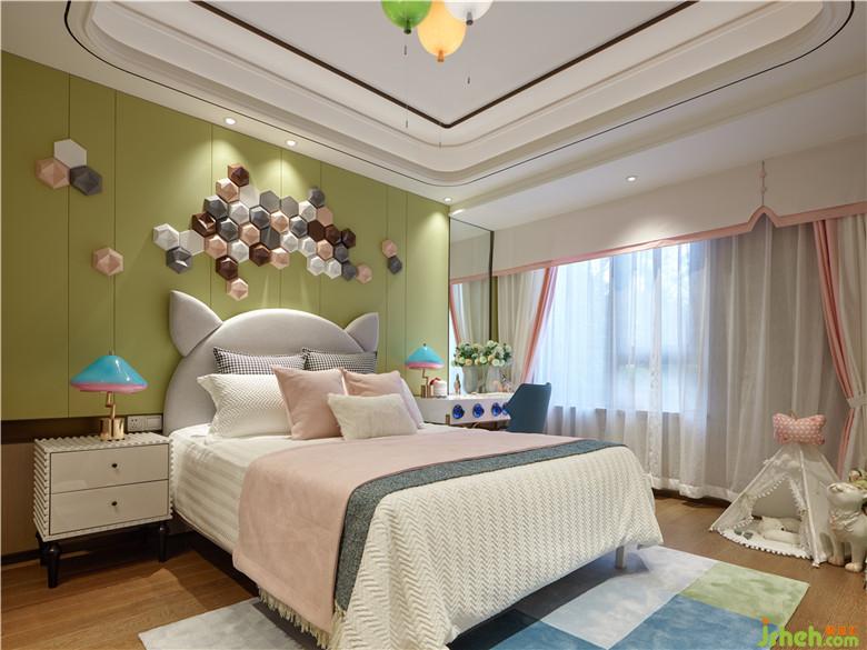 而臥室空間窗簾與床品顏色的互相輝映,突出詩意畫境。吊頂加以黑色線條過渡空間層次,
