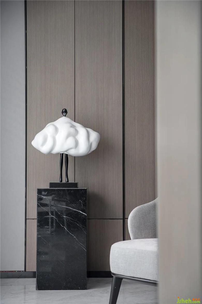 物件作為空間的載體,其添置、鋪呈不單是空間的過渡,更是與人物,物與空間對(duì)話的“符號(hào)”。木的溫潤,大理石的素凈,織物的柔軟,都稀釋著黑色不銹鋼墻面帶來的冷峻感??臻g的玩偶藏匿著樣板房設(shè)計(jì)師對(duì)生活的玩心,工藝拙中納巧,彰顯著居住者特立獨(dú)行的個(gè)性。