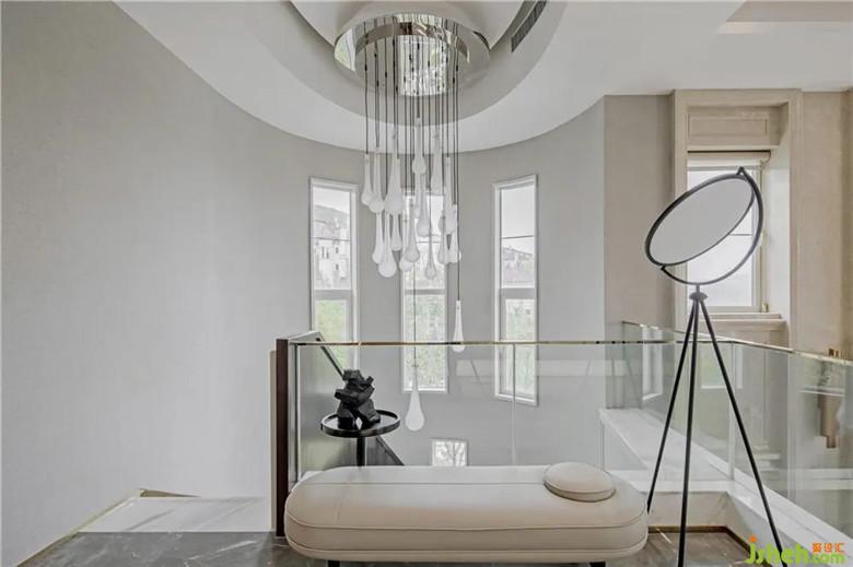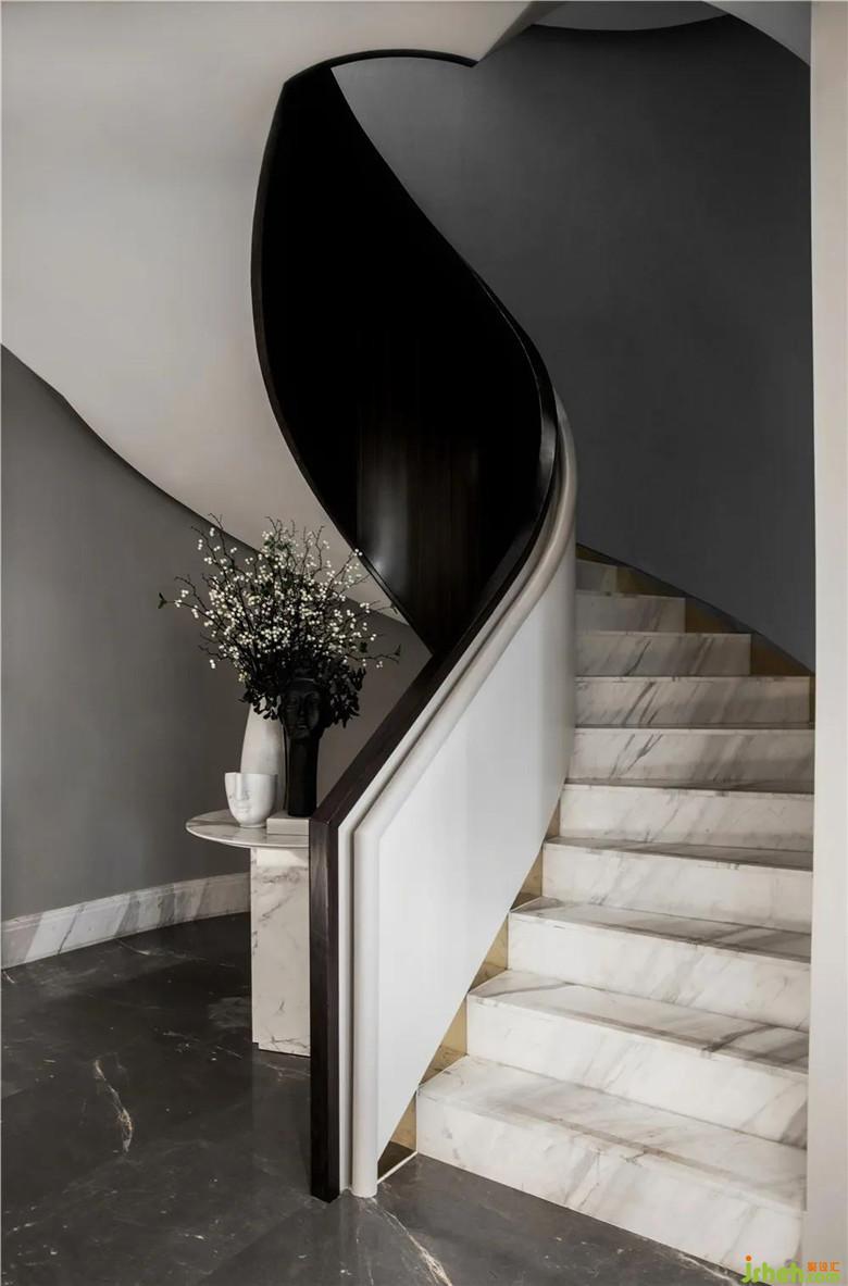驚艷于樓梯區(qū)域的野逸氣息,一曲以木材譜曲、大理石填詞的漣漪旋律,帶我們進(jìn)入另一個(gè)形式維度,看似靜默的、堅(jiān)硬的、樸素的材質(zhì)組合,卻能和諧地相融于一室,造就空間曠遠(yuǎn)疏朗的形體。樓梯間點(diǎn)綴的花束及藝術(shù)品灑落的綿綿星點(diǎn),形成少即是多的點(diǎn)睛之筆,透出些許意境。