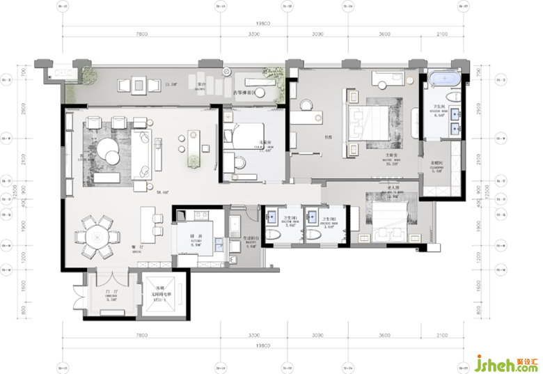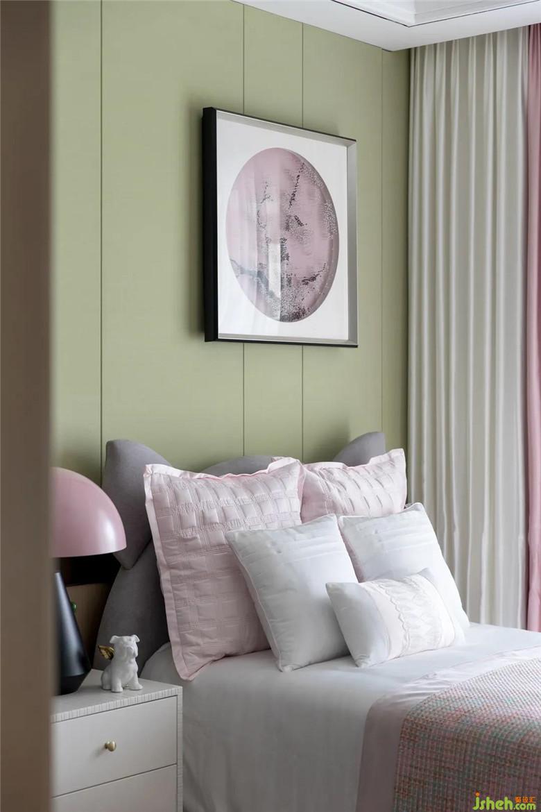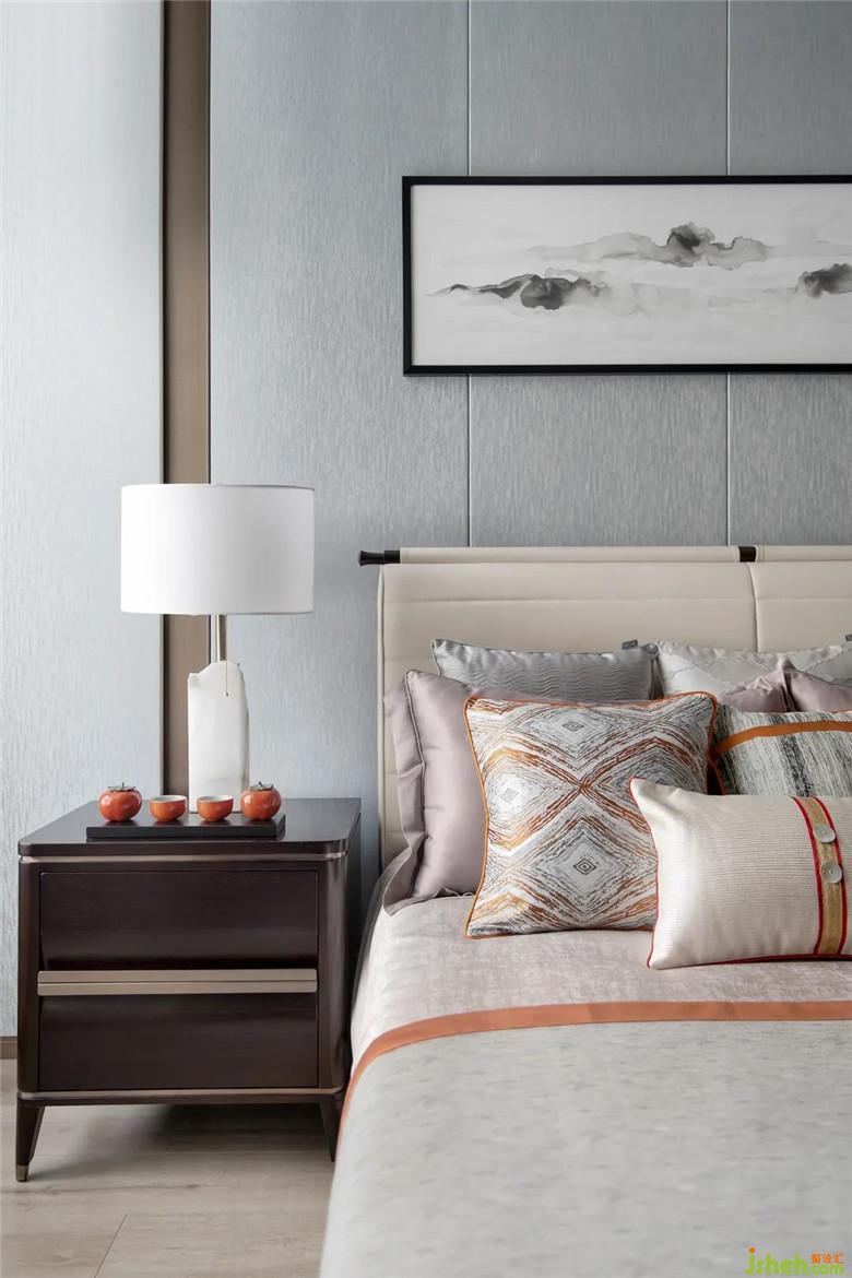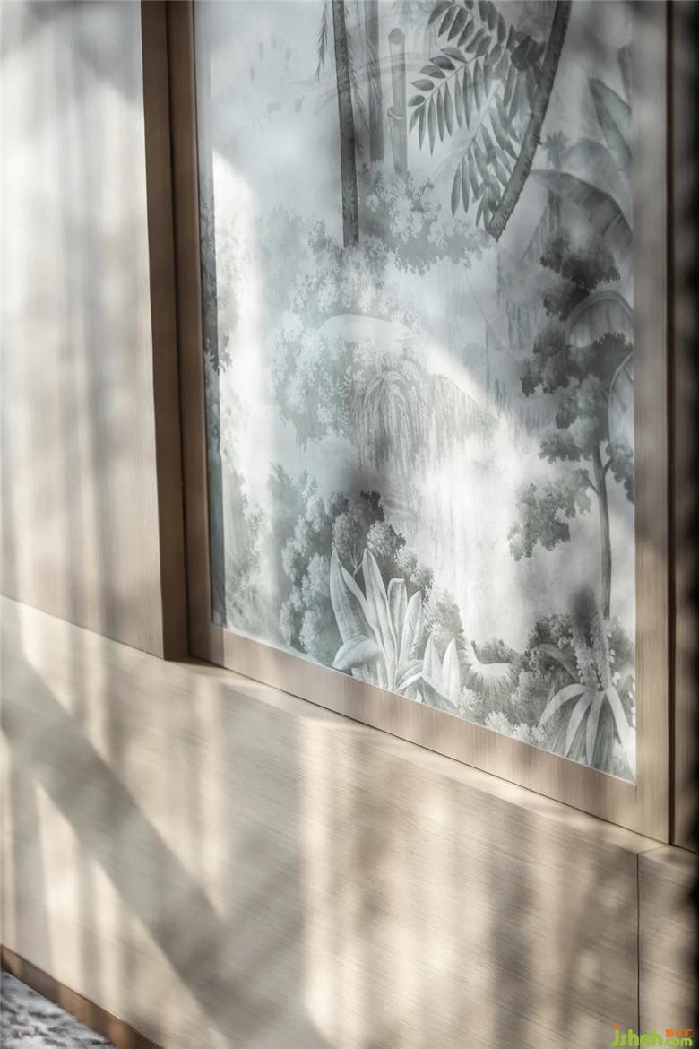 行至起居室,歲月刻于門窗欞飾上,座椅、瓷具、書卷等在形制上樣板房設(shè)計(jì)采用古雅今情的表達(dá),考量充分的美學(xué)性,細(xì)微的閑情逸趣被寫入床頭內(nèi),清雅山水畫卷后,實(shí)為移門屏風(fēng),推開即書房,清雋別致間,渲染大隱于市的棲居生活