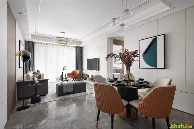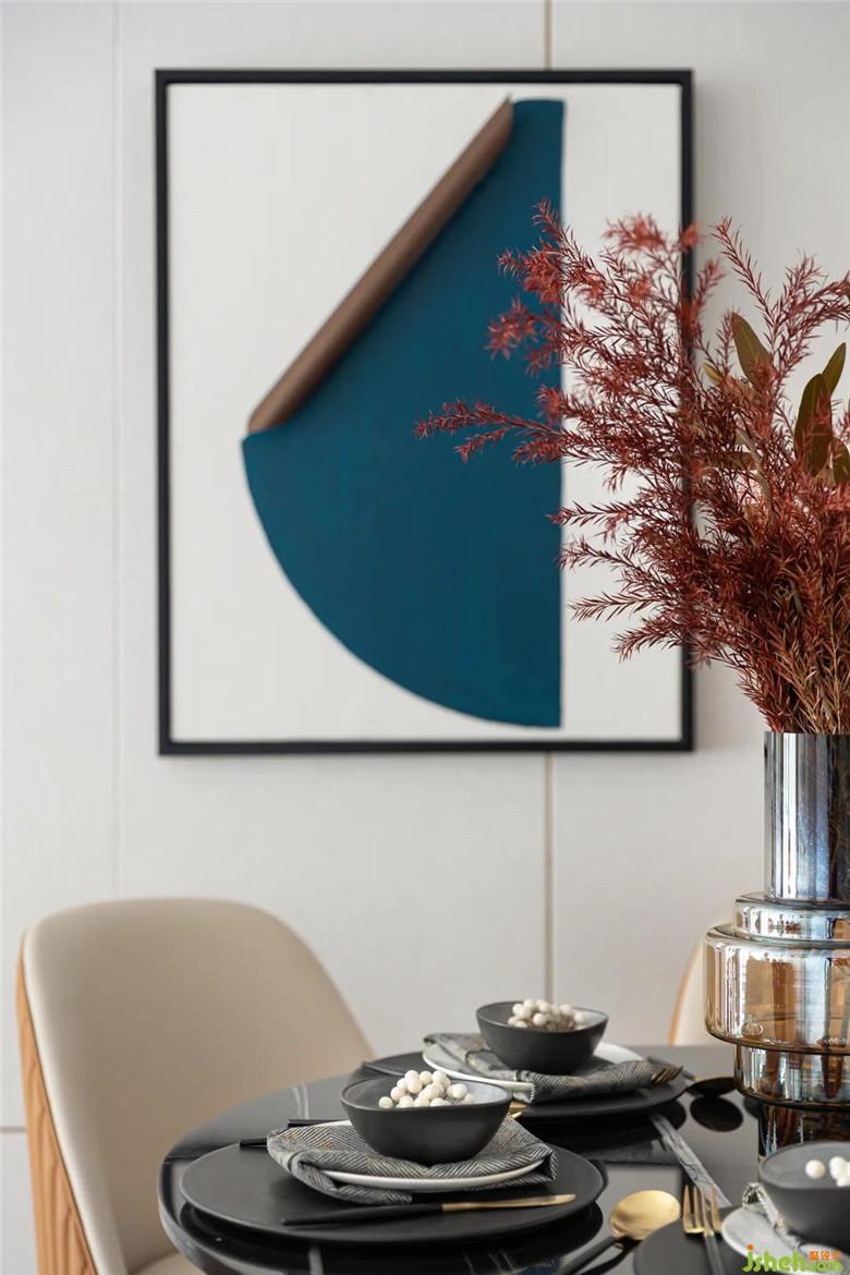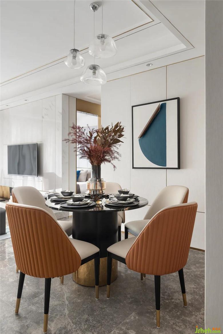 家人的合離,似乎總能通過食物來滋養(yǎng)其間的欣喜哀傷,具象關(guān)于生活的美好模樣。用餐區(qū)在以橘色擔(dān)綱起空間本色,墻面的的異性金屬體塊,揮灑空間的時尚與層次感。
