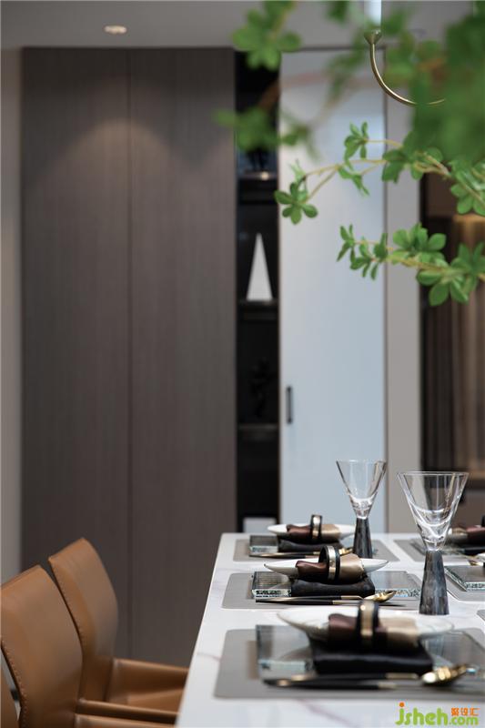 餐廳立于沙發(fā)后方,設(shè)計(jì)悉心于長型的餐桌而帶來的開闊感,創(chuàng)造舒適合理的用餐區(qū)域。胡桃色墻面設(shè)立酒柜兼具收納功能,搭配線性燈,樣板房設(shè)計(jì)為擱置其間的器皿投下一道重彩。在此,一杯紅茶,一疊小菜就足以溫暖這處空間。