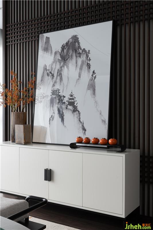 硬裝布局以非常精確的比例關系來描繪生活態(tài)度至上,開放式餐廳與茶席,也瞬間拉近了心理上的距離,傳統(tǒng)的中式餐桌椅,搭配飽含東方韻味的圓形水墨畫,以及棉麻的桌墊與盆景茶具,人文墨客推杯換盞的隱居生活畫面,悠然而愜意!