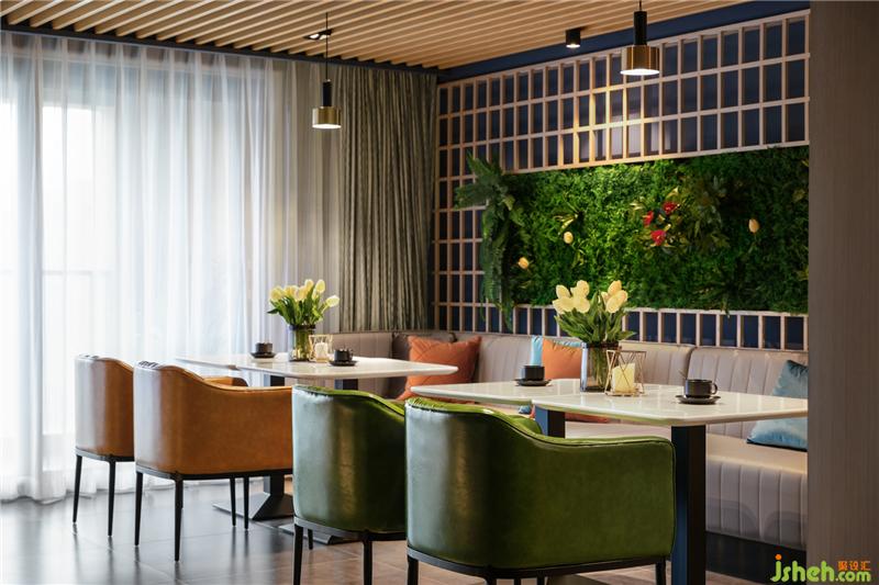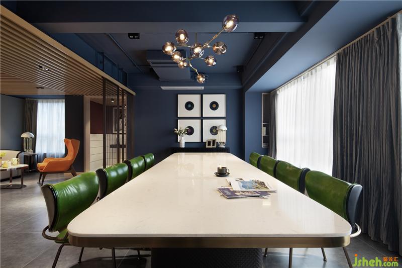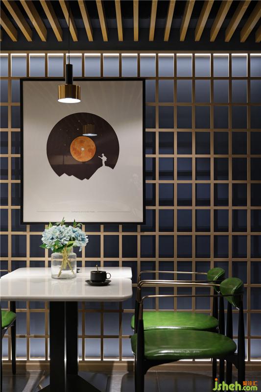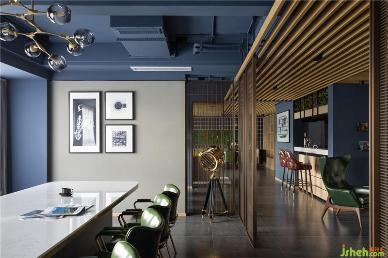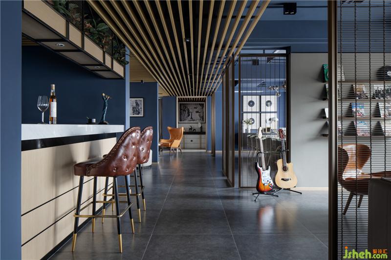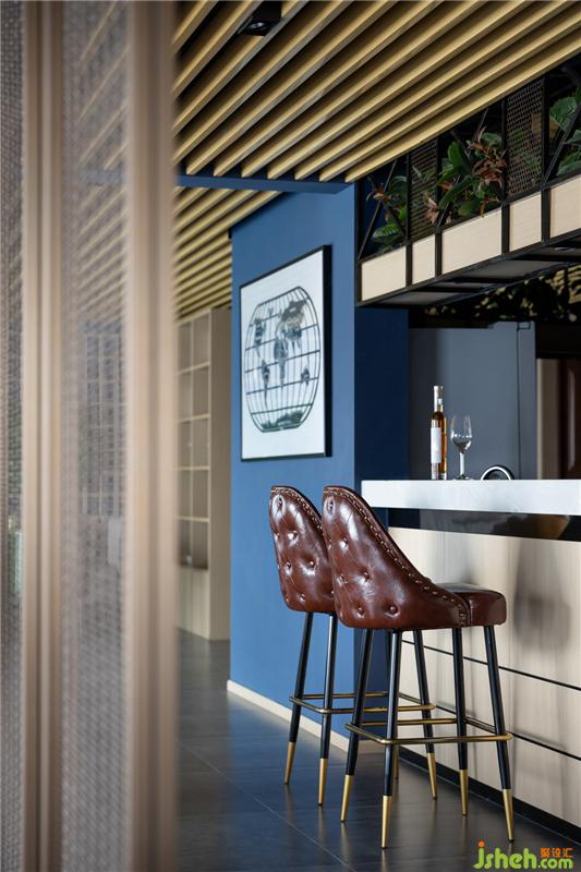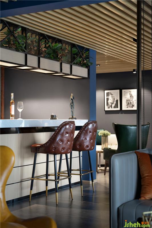 空間的魅力來自色彩的跳色與點綴,高識別度的深藍與深咖啡色的勾兌作為色彩主體,刻意做舊的深咖色皮革座椅營造出沉穩(wěn)與質(zhì)感,為了避免厚重感,其間以綠植過渡空間的冷酷和剛毅,且點綴寫翡翠綠、明黃在其中,日光微閃下,整體都散發(fā)著晶瑩剔透的光暈,滿室極具情調(diào)。