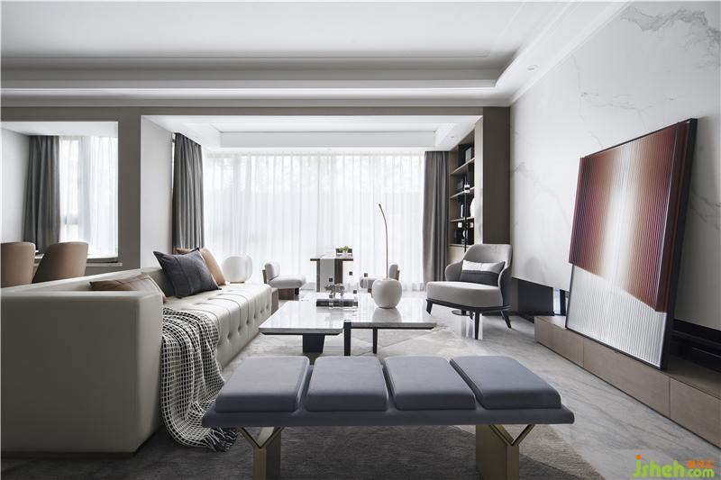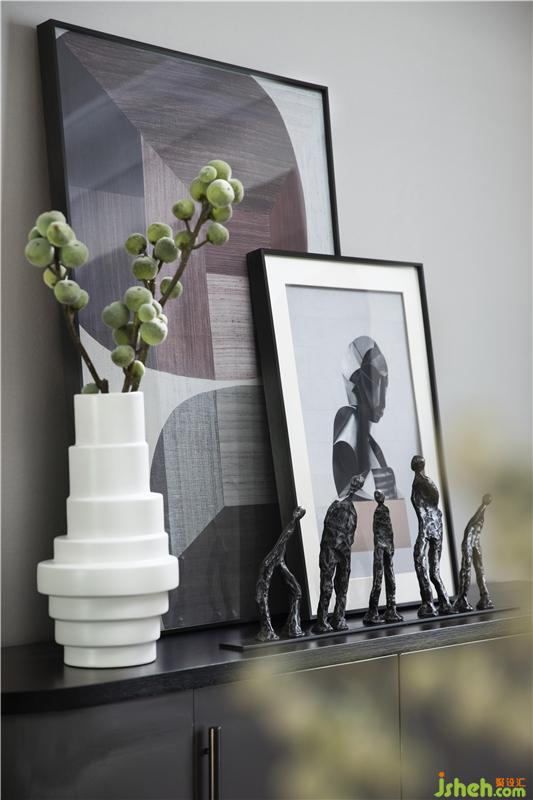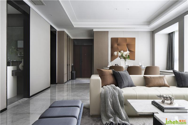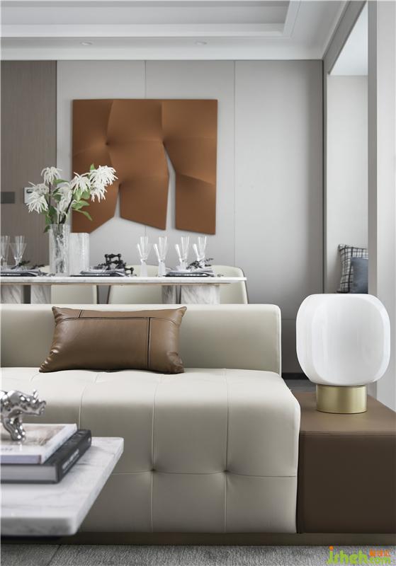 鉛白、飴色、黑茶營造色彩與器具間的相生共構,沙發(fā)與大理石墻面的組合,略帶一絲港式輕奢的格調,柔和不乏雅致的高級感,倚著墻面靠立的紅白裝飾畫,線條簡而有力,切割出設計對空間滿而不溢的把控。