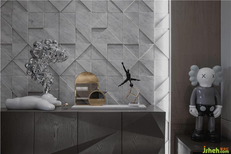 尤其在臥室,吊頂因客觀因素,借鑒中式徽派為設計靈感,結(jié)合實際梁位打造出不一樣的吊頂。利用帶有潑墨的山水畫意境的石材,加入藍色作為調(diào)色,在整個空間中具有錦上添花之作用。使得置身于其中而吐故納新、恢復元氣,盡情受益于其輕松、休閑和愜意的氛圍。