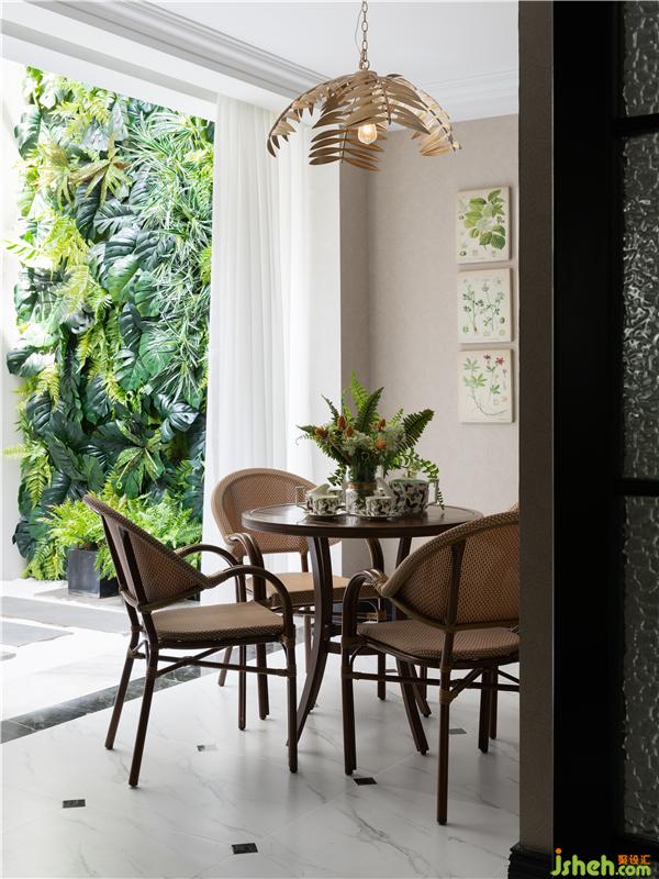 炎炎夏日,室外綠樹如蓋,知了喧天,室內(nèi)溫情敝屣。下沉式庭院并無其他物體填充,做減法的設(shè)計在滿足功能的同時兼具視線所及的美感,單一套座椅,便能滿足居住者休閑的需求。