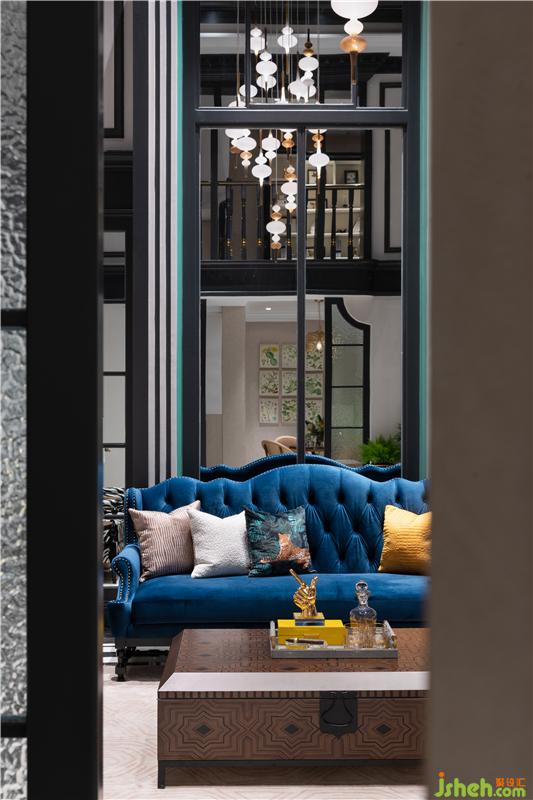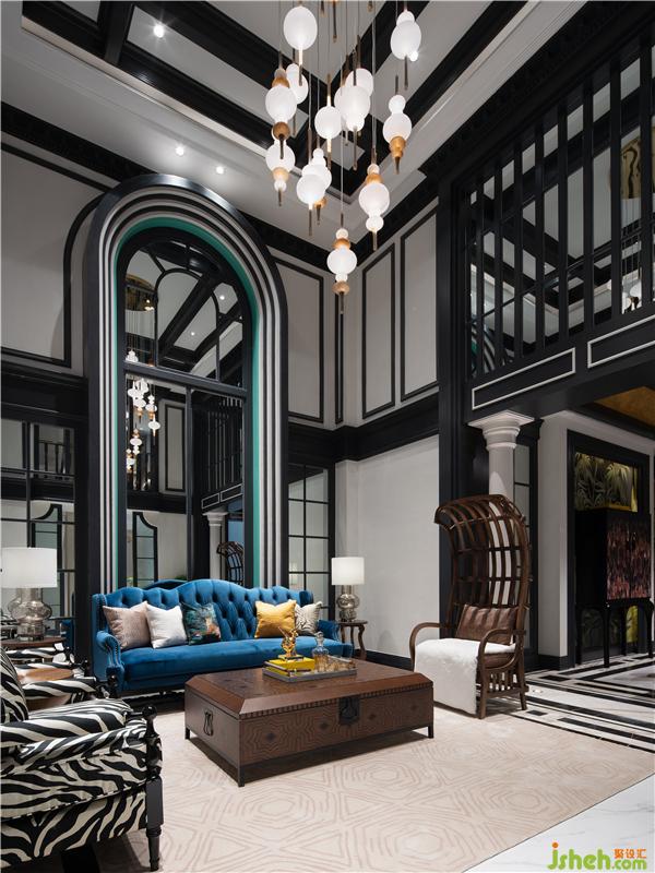 進(jìn)入party區(qū),超挑高法式拱門勾勒大廳的敞闊感,空間恰到好處的線條點(diǎn)綴,產(chǎn)生新與舊的對(duì)話。休閑區(qū)實(shí)用性必不可少,party區(qū)一側(cè)細(xì)致地安排了酒吧區(qū)及酒窖,大面積的黑色搭配,為空間投下一道重彩。