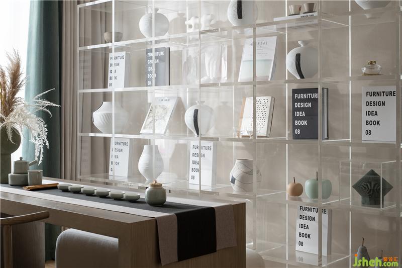 這里還陳列著主人愛(ài)好的抽象藝術(shù)畫(huà)作,調(diào)皮的小貓、連續(xù)的水平線條理性而優(yōu)雅,具有強(qiáng)烈的秩序感。入戶右邊的茶室,充滿了儀式感,樣板間軟裝設(shè)計(jì)透明的置物架在陽(yáng)光下散發(fā)著熠熠的小光芒,那些看似平凡尋常的小器物擺放在一起,給觀看者提供了喚醒給予世界另種解釋可能性的機(jī)會(huì)。同時(shí),空間又可根據(jù)使用者,功能變化,可以是直播工作間,客房,書(shū)房,花房等等承載生活。