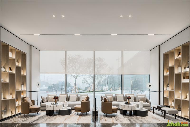 整個(gè)建筑為方形建筑,側(cè)為整面的玻璃幕墻,結(jié)合建筑。建筑的特性使得重慶售樓處室內(nèi)區(qū)域光線成為鋪滿整個(gè)空間點(diǎn)。所以我們?cè)O(shè)想在區(qū)域內(nèi)讓陽(yáng)光作為空間線索,使得整個(gè)建筑從外看就仿佛是一幅震撼的畫卷。并且通過(guò)它來(lái)串聯(lián)整個(gè)空間。