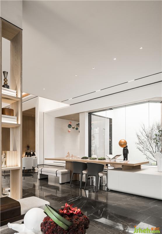 在極簡(jiǎn)的布藝沙發(fā)、溫潤(rùn)的木藝列架、抽象線條的編織地毯之間,構(gòu)建起一個(gè)可安靜交流的功能空間,以豐富而實(shí)用的場(chǎng)景呼應(yīng)空間的復(fù)合態(tài)。