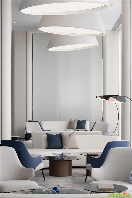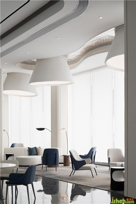 洽談區(qū)以對稱的構(gòu)造交互、流動的空間內(nèi)外部關(guān)系,以及水波紋不銹鋼吊頂來反射光的紋路,來加深場地本身給予人通達(dá)五感的多樣體驗,并以此形成了空間內(nèi)部的敘事邏輯。