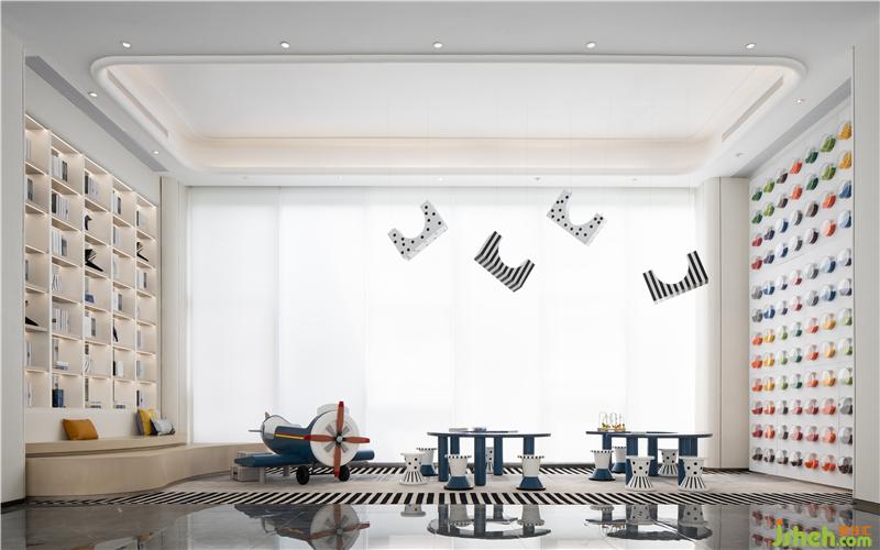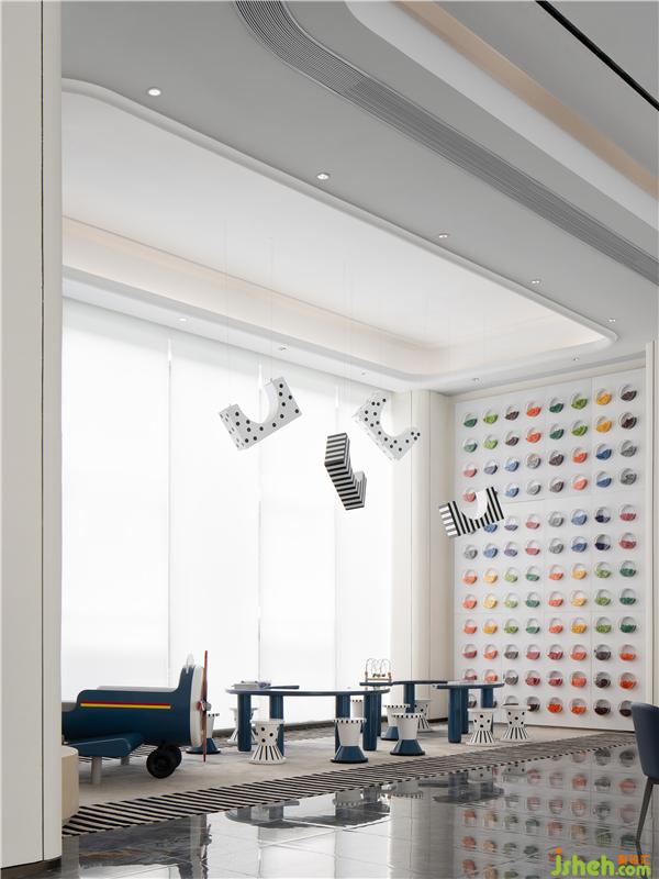 兒童區(qū)的懸浮積木裝置別出心裁,呼應(yīng)可互動的樂高積木,再基于審美與藝術(shù)中的內(nèi)省體驗、直覺感情的發(fā)散表達(dá),梳理出整齊劃一的氛圍,臨窗一側(cè),整面落地的玻璃窗,消除了室內(nèi)外的邊界限制,在此交換感知。