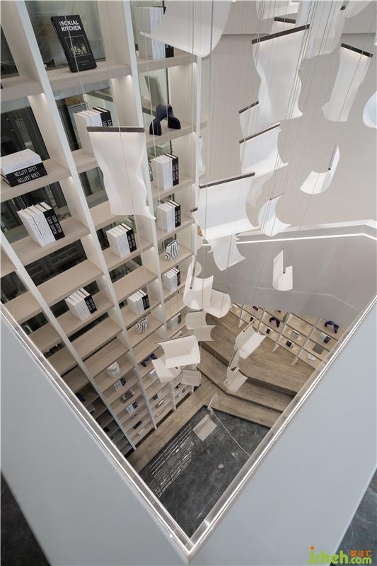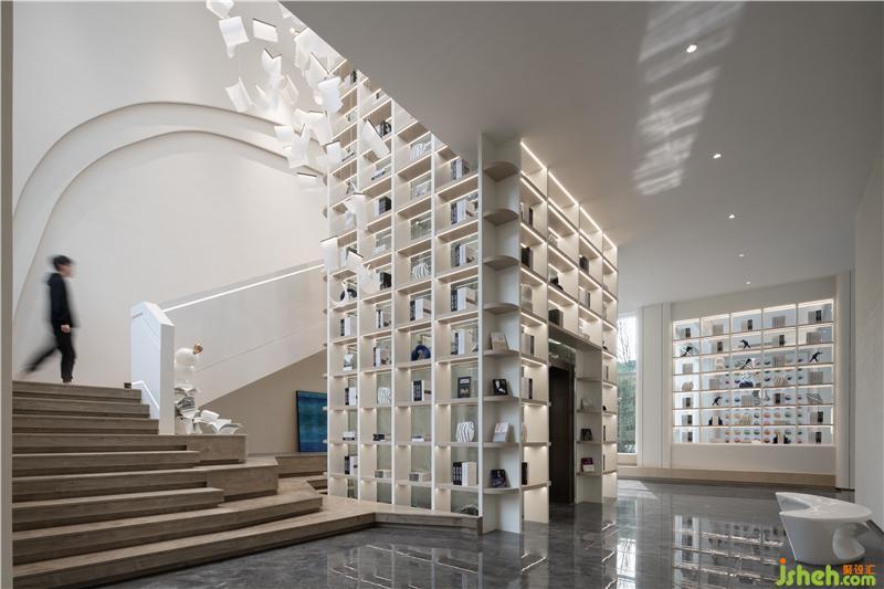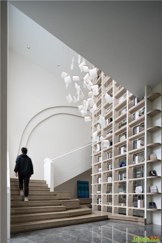 轉(zhuǎn)角的通天書架搭配書頁形狀的燈飾,在自然質(zhì)感的空間中相互呼應(yīng)又彼此消化,以一種精神性的致敬,共同成為空間無限“延伸”的力量來源。
