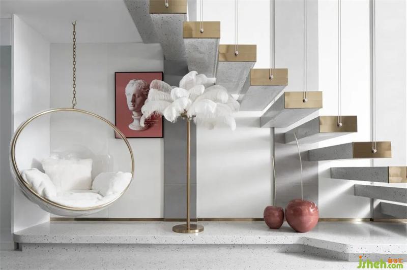 生活的趣味性發(fā)生在這處似斷非斷的獨(dú)立空間,純美羽毛落地?zé)?、?mèng)幻的公主吊椅被安置在樓梯下方,落座于此,閱讀書籍、獨(dú)飲淺酌,都讓生活更添一份閑逸、舒適