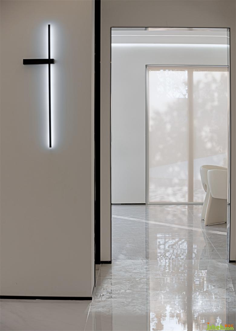 步入品牌的時(shí)空連廊,通透開敞,卻又內(nèi)斂聚和。設(shè)置在大面積白色背景的線性燈光將空間輪廓勾勒出來(lái),與大面積的可視幕墻的光形成鮮明對(duì)比,營(yíng)造出時(shí)空“隧道”中的光影場(chǎng)景。