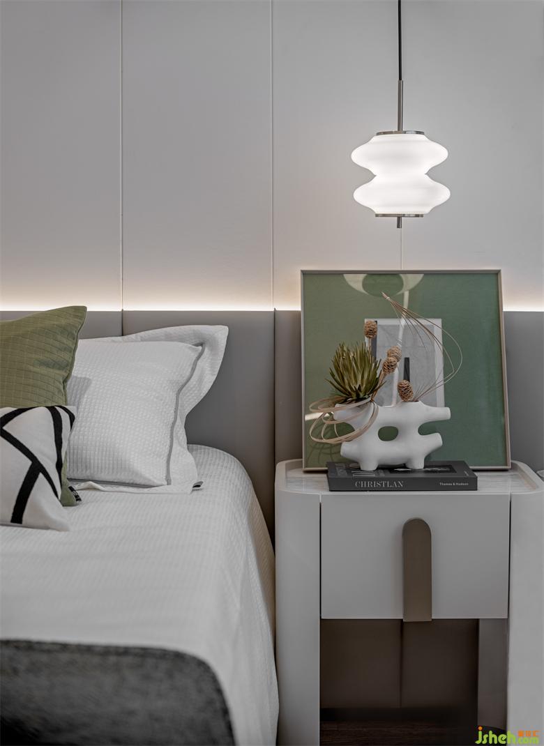 低飽和度的家,泛著金度假感覺的裝置飾品,樣板房設(shè)計(jì)奠定了空間低奢雅致而又不失溫馨的基調(diào),而地面木紋和干凈的墻面、簡(jiǎn)約大方的床頭吊燈、柔和體塊的灰白色地毯,將文化的蘊(yùn)涵、美學(xué)的多義、生活的意趣放入寬闊的藝術(shù)視野中,意猶未盡……