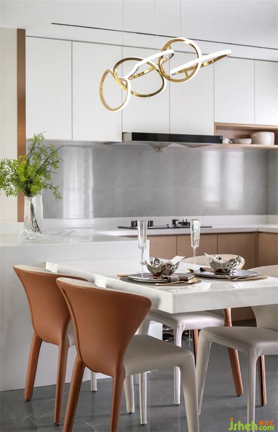 簡靜的理石白餐桌,與雅致的皮質棕餐椅,在極具當代氣息的金屬線型燈光的映照下,平衡著餐廳純粹而高級的美學氛圍。樣板房設計與此同時,灑進室內陽光也如期而至,猶如一幅天然的背景畫,為空間敘寫著此間情境的美感。