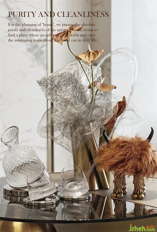 懸浮透明的茶幾,為茶室增添了幾分浪漫色彩,去貼合目標(biāo)人群閱歷世界之美后的靜謐安然。樣板房設(shè)計(jì)設(shè)計(jì)于人的體驗(yàn),同樣是有顏色、有聲音、有味道,喚起內(nèi)在的精神共鳴。單是風(fēng)格色彩,就結(jié)合了意式的簡約、宋式的簡省,透射出奢華的淺色、淡雅的白。