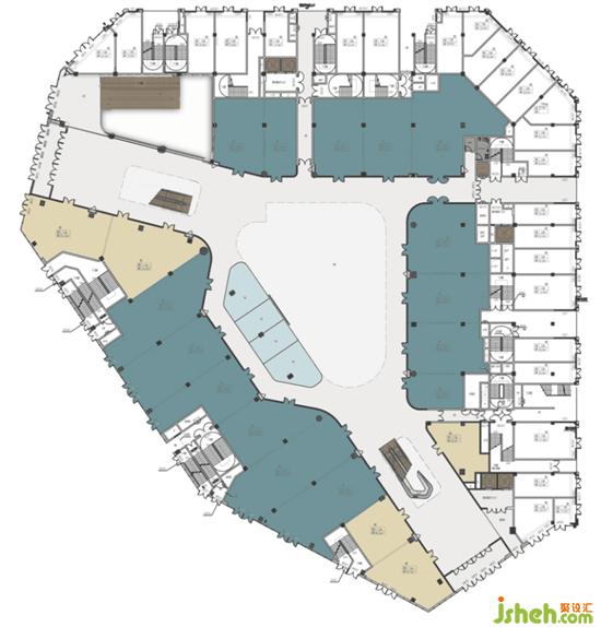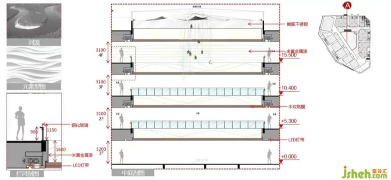 提出峽谷溪流的構(gòu)想,通過(guò)曲線條的穿插,與自然結(jié)合,呼應(yīng)本真與自我,攔河運(yùn)用米黃色金屬漆和曲線的形態(tài)勾勒手法在空間里詮釋,地面運(yùn)用幾種人造石的色帶,演繹河流的動(dòng)感,在空間里起到引流的作用,在中庭處形成空間亮點(diǎn)。