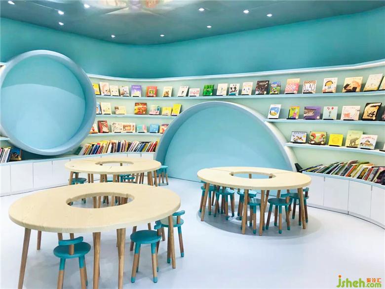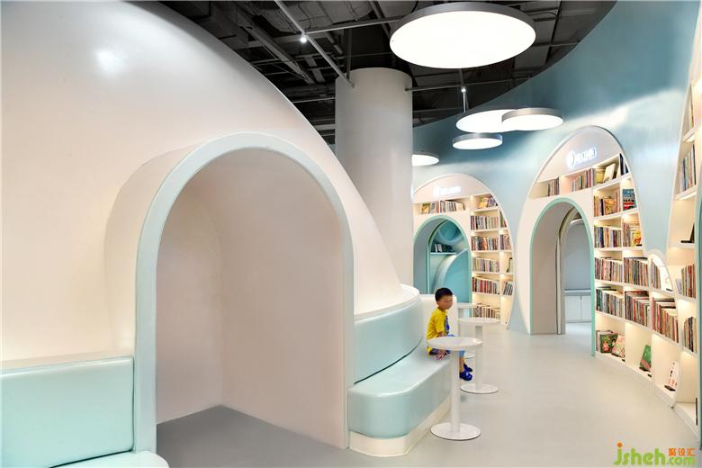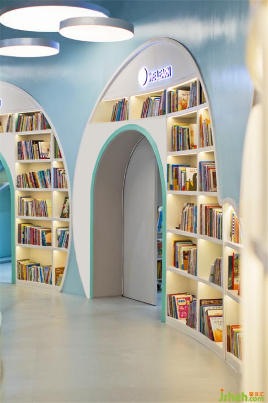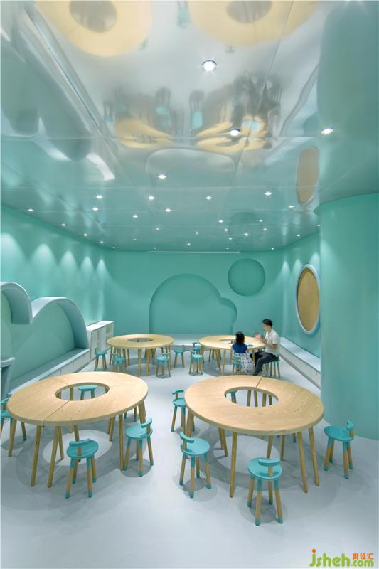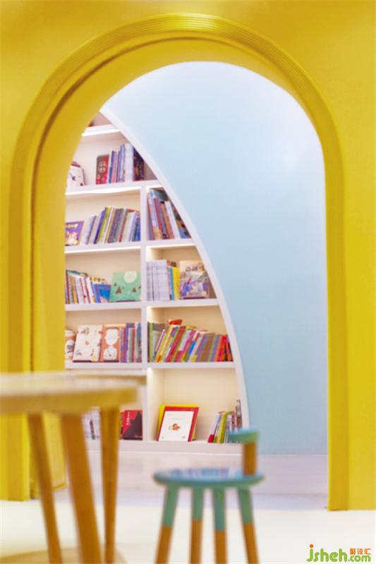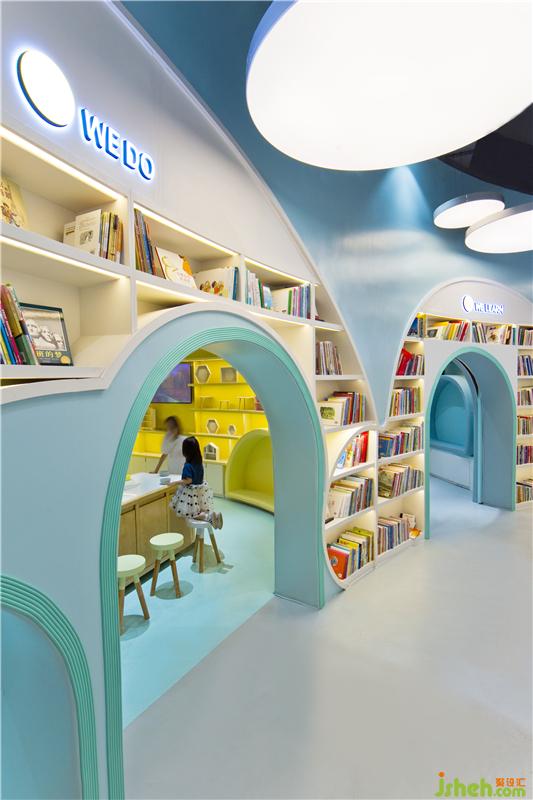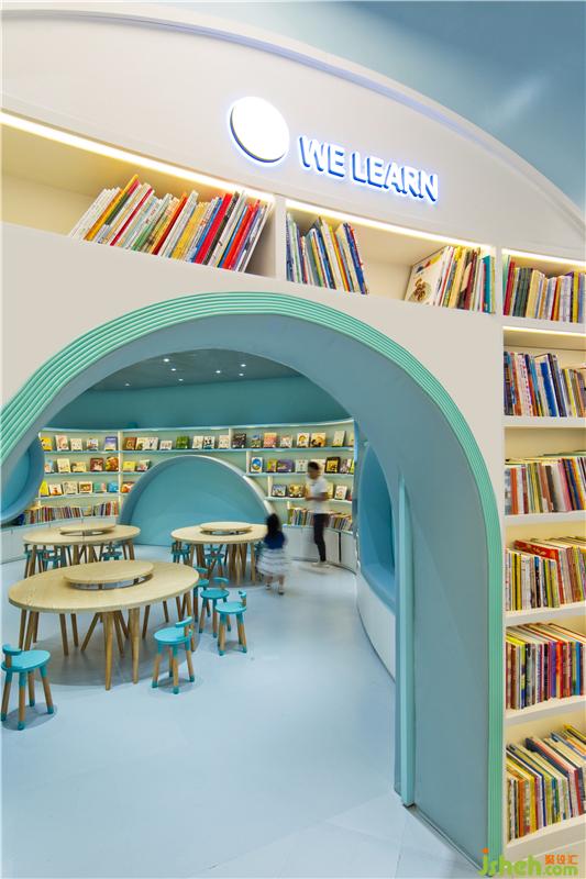 在第二個空間,圓頂沉浸式劇場設(shè)置了360度投映,家長和小朋友可以在內(nèi)一起感受多媒體互動學(xué)習(xí),聽講座,辦讀書會,并且還可供會員開展兒童生日派對。兒童書店設(shè)計圓頂劇場被多用途兒童教室和全日制親子餐廳包圍,為父母提供專門的休息區(qū)域可供交友,放松,談話等活動,除此之外,更是貼心地為大家準(zhǔn)備了烘焙教室,使得孩子可以和父母一起體驗烘焙的樂趣。其中采用明黃色和嬰兒藍(lán)的半開放式教室是為了讓孩子們放松心情,消除與教師之間緊張的相處模式,在良好舒適的環(huán)境中激發(fā)出他們的學(xué)習(xí)興趣。