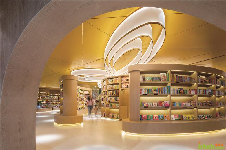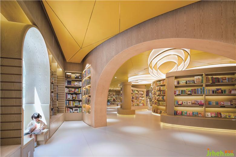 零售區(qū)域是一個售賣兒童繪本,圖書和文具等不同類別產(chǎn)品的一個人性化空間,溫暖的色調(diào)由天花的黃色和全高木皮的墻體和書柜所創(chuàng)造。在不同的曲線組合上面我們創(chuàng)造了有開放式和私密式等不同的閱讀區(qū)域,加上自然光線所賦予的一些閱讀窗口,給父母和兒童一起在這個零售空間中沉淀心靈和專心閱讀。