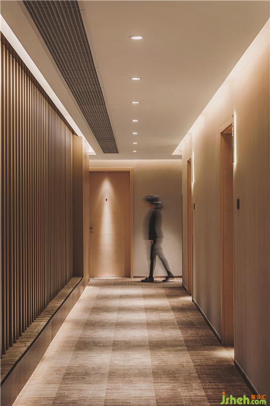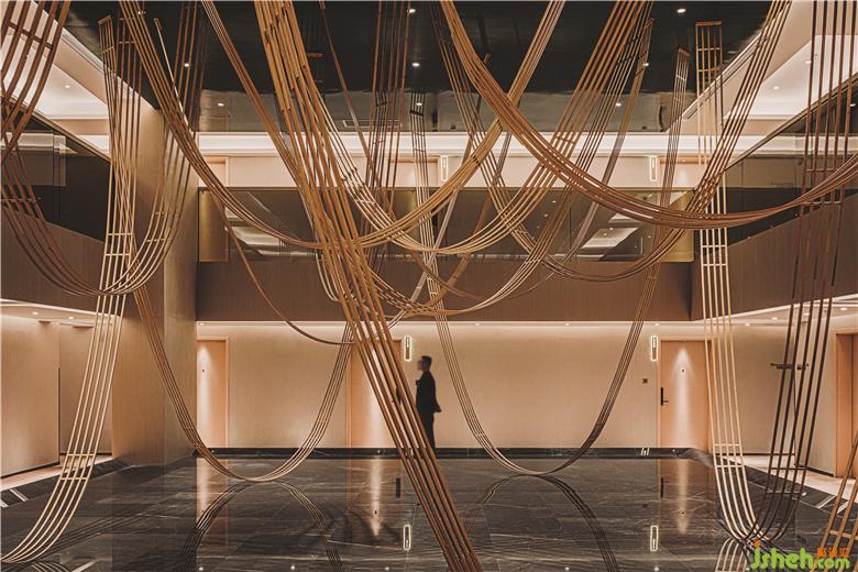 每?jī)蓪涌头慷家肓穗p高中央庭院。一個(gè)反射性的湖面,竹制的舞蹈曲線自然落下,仿佛在空中漂浮著云朵。這種天花板懸掛結(jié)構(gòu)再次與竹編織大師協(xié)商如何利用其自然彈性和傳統(tǒng)連接方法創(chuàng)建曲線。到達(dá)房間前,客人會(huì)感覺(jué)像穿過(guò)一片抽象的竹林。
