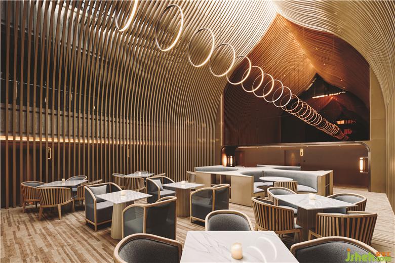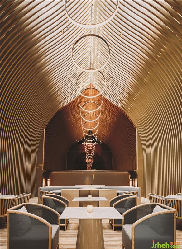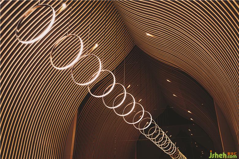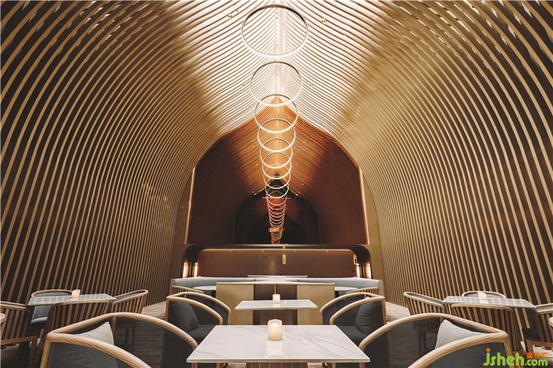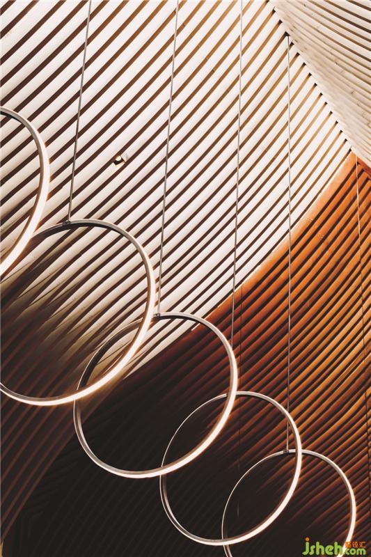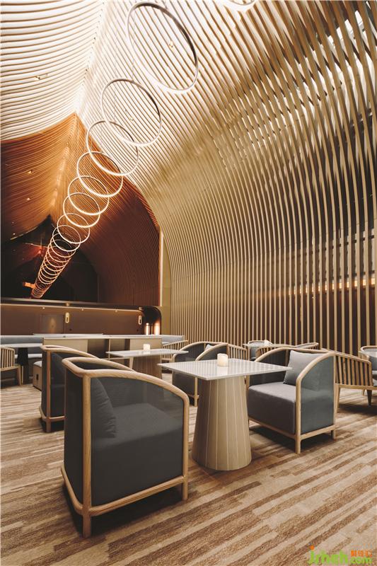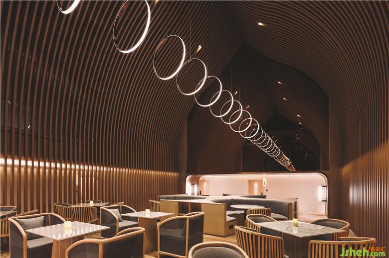 在頂樓的SkyCafé,全高的竹子結(jié)構(gòu)構(gòu)成了禪宗和教堂般的空間。上方的天窗可以讓白天的自然光落在座位區(qū)的中間。商務(wù)酒店設(shè)計(jì)吊頂懸掛的圓形LED燈形成無(wú)盡的發(fā)光月亮,并在夜間為客人提供詩(shī)意的體驗(yàn)。