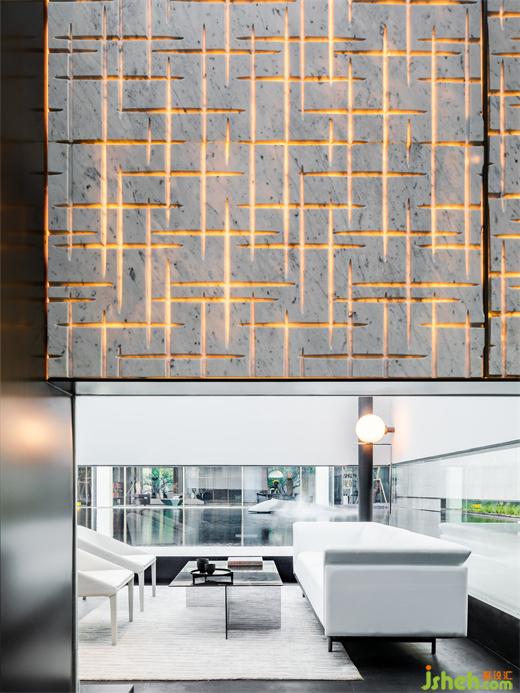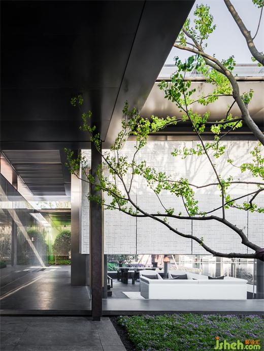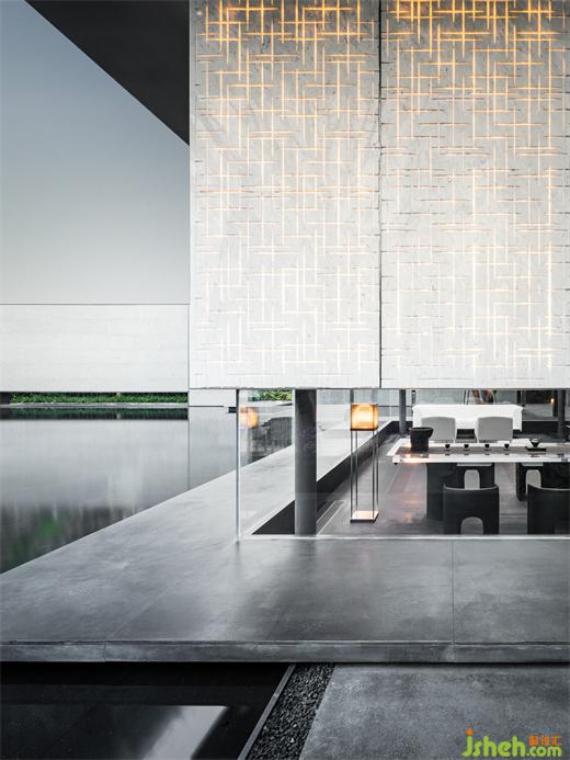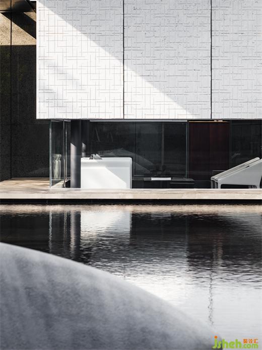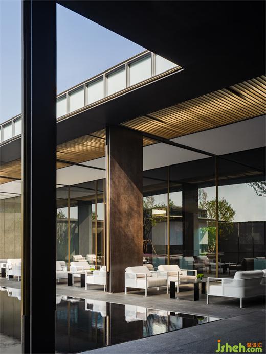 步入建筑,迎接我們的是一場典型的東方體驗,“藝術展廳”奠定了整體一層的空間命題。南京會所設計門廳以精致客廳的面貌傳達強烈的歸屬感,暗示出服務對象的性質。隨著動線轉折,將步調放緩,必經(jīng)路徑上不同的展示內容,沙盤、模型及其他藝術品甚至拾得物皆作為資源融入設計想象,在保持審美統(tǒng)一的前提下層層遞進,為人們到達中心空間的高潮進行鋪墊。南京會所設計建筑表皮垂直方向有韻律的吟唱于展廳空間內部得到了明確的響應,內外體量牢固結合。經(jīng)過反復論證,于?廳中軸線方向增設“覺知亭”與其隔水相望,以一個“點”將空間構圖錨固。