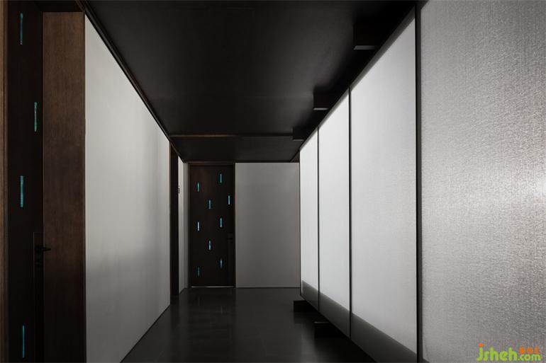 經(jīng)過(guò)陣列式的柱廊,有亭躍然水面,由四根纖細(xì)的柱體支撐,應(yīng)用抽象化的思維表達(dá),南京會(huì)所設(shè)計(jì)使亭脫離水面又與蕩起的漣漪產(chǎn)生互動(dòng)。坐于亭中,三面玻璃通透,輕薄的和紙依附其上,光線的穿透被削弱,微風(fēng)浮動(dòng),竹影斑駁,穿堂而過(guò)的風(fēng)聲,帶走門廳給人的厚重,實(shí)現(xiàn)了對(duì)偶空間的輕盈。