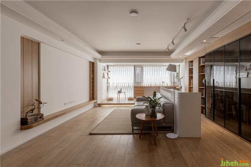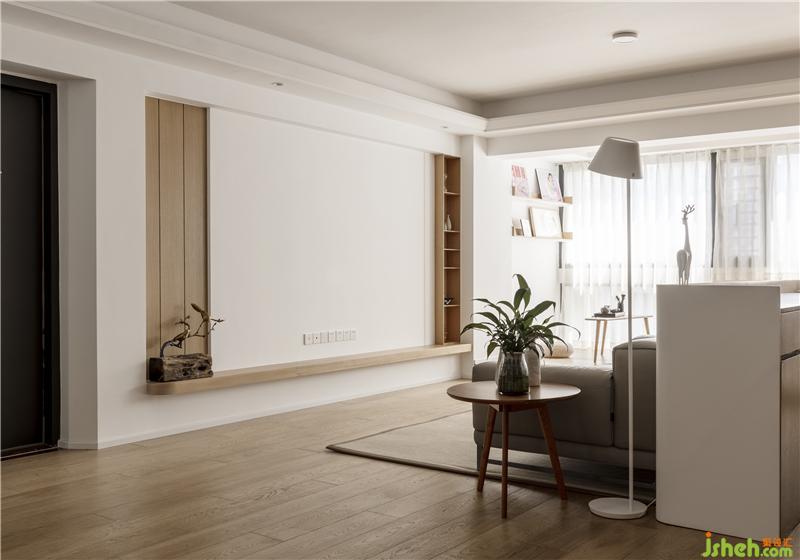 入戶沒有玄關,左右兩邊分別是餐廳和客廳。全屋木地板鋪設,白+木紋淡淡的日式溫馨設計。