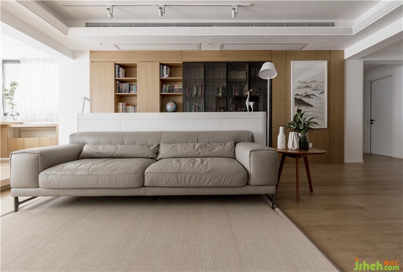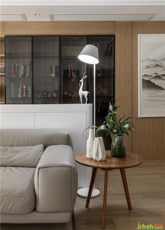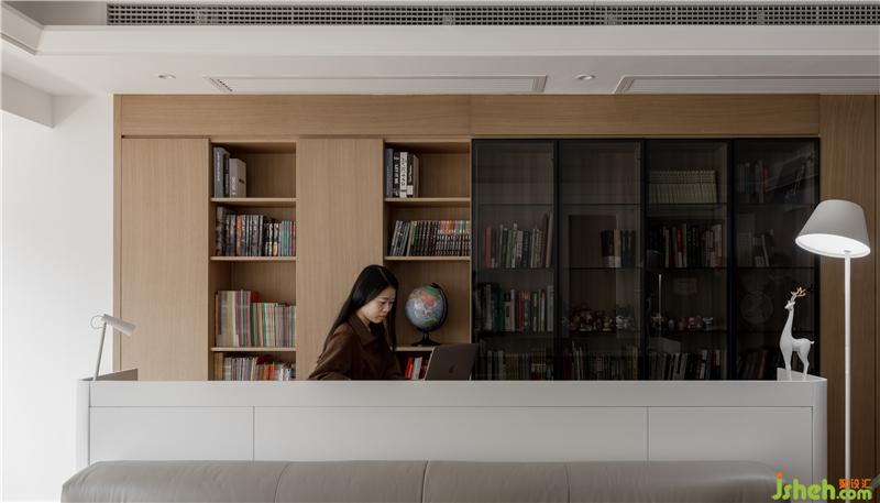 主體大書柜長3280mm,同樣嵌入式的設計,保證了空間的平整。采用玻璃柜門、木柜門及鏤空柜體協(xié)調設計。入戶即映入眼簾,時尚大氣。