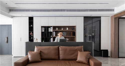 客廳凈寬5030mm,由于屋主一家平時不看電視,我們將沙發(fā)前置一點,后方區(qū)域打造成書房。同時利用高吧臺作為沙發(fā)靠,同時也是書桌,長達2800mm,可最多同時容納一家人共同閱讀。