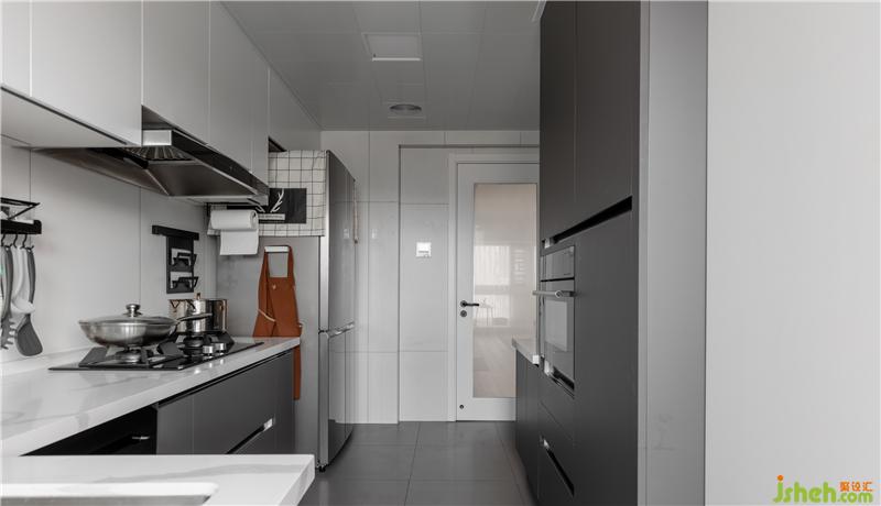 廈門裝修設計灰色地柜和白色高柜,和純白的墻磚、純灰的地磚想結合,整體協(xié)調(diào)統(tǒng)一,啞光烤漆的材質(zhì)也非常便于廚房的清潔和實用。