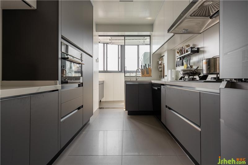 廚房位于餐廳右側(cè),一字型通高柜+L型臺面相結合,廚房與生活陽臺相連接,陽臺一側(cè)為洗衣池,另一側(cè)我們將洗衣機烘干機疊放,旁邊嵌入420*600的地柜,放置洗滌用品。動線順暢并滿足各種生活收納的需求。
