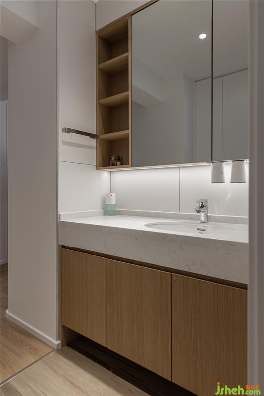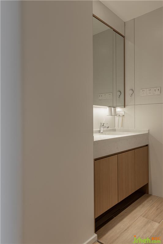 洗手池外置后,不僅將原來客廳的大柱子完美融入,臺面尺寸更高達1200mm,非常寬敞舒適了。由于是濕區(qū),所以我們這個區(qū)域采用木紋磚的鋪設。