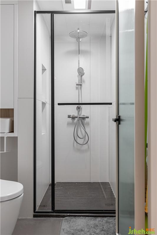 改造后淋浴房尺寸為870*990mm,我們將所有的管道用壁龕和收納柜包平,壁龕正好給淋浴房放置洗浴用品,而靠近馬桶的柜體則只做上方柜,用于放置紙品家清,下方鏤空設計抽屜柜,放紙巾等,同時避免了下方柜體不方便打開的尷尬。
