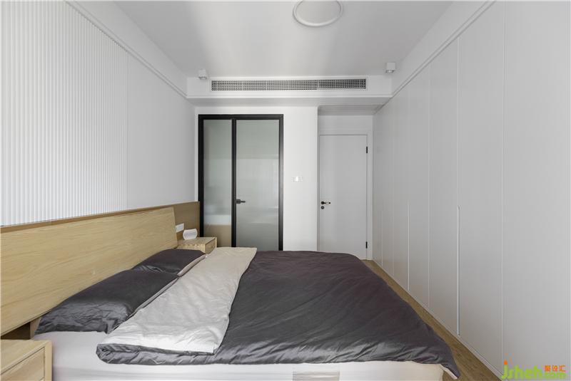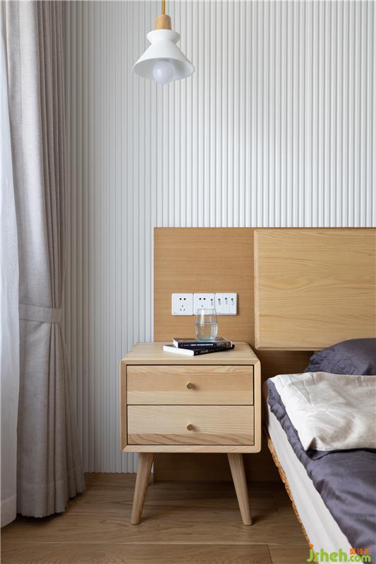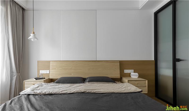 主臥整體風格是非常淡雅的,床頭背景以白色木格柵配合半墻木色背景墻做層次。