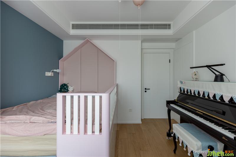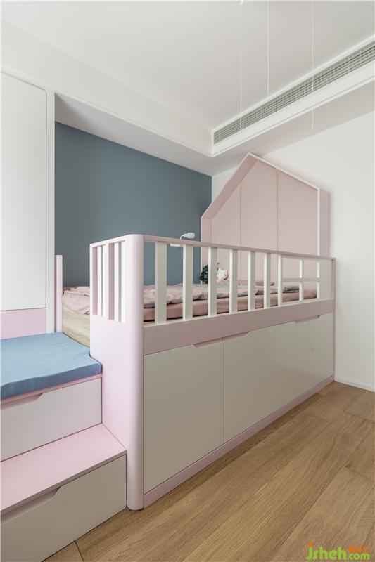 妹妹的房間安排了躍層床,漂亮得很哩。下方為儲物空間,也可作為游戲區(qū)。
