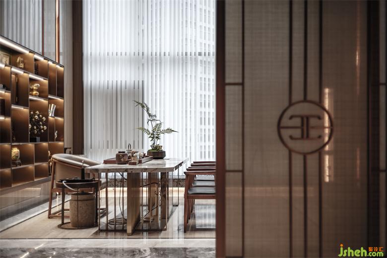 順著玄關步入茶室區(qū)域,與陽臺共通,大面積落地窗讓整個空間被窗外的自然光線所浸透。室內(nèi)頂部及相應柜體為相互呼應的顏色,用線條感帶動整個空間的靈動性,柜子與電視嵌入墻面更顯高級感。家裝設計在茶室設計中,推拉門的元素是對茶室構成要素進行再設計,以此展示不同以往的新中式茶室風采。
