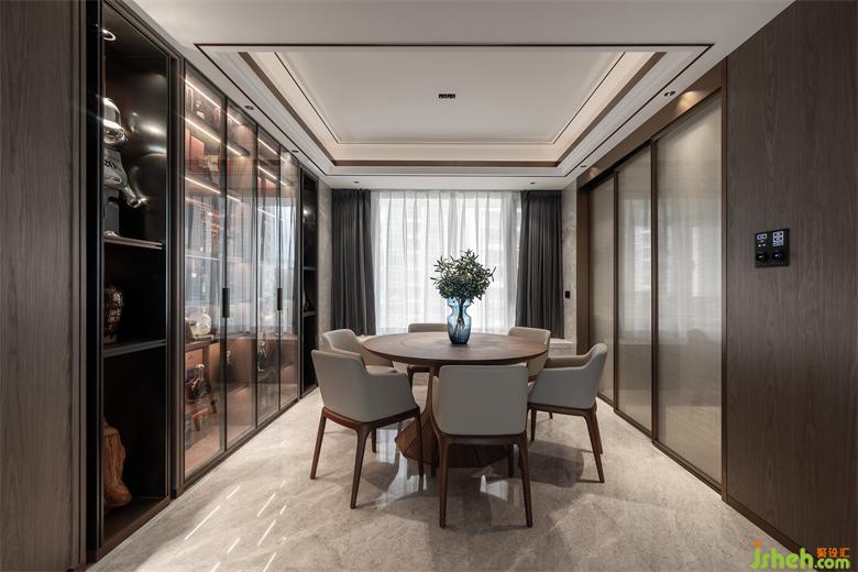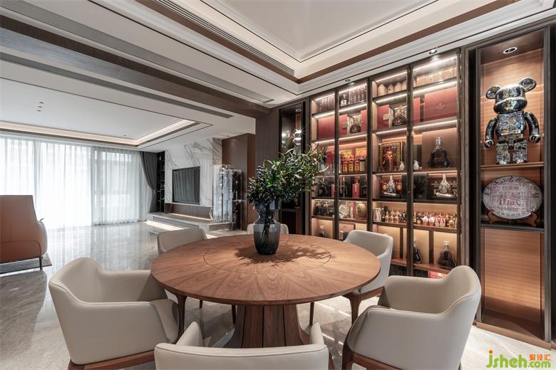 時下比較流行且受歡迎的木飾面客廳背景墻設(shè)計(jì),搭配明亮色系沙發(fā),是豪宅酒店常用的設(shè)計(jì)手法。家裝設(shè)計(jì)客廳連貫著餐廳,空間兼容性強(qiáng),顏色搭配極佳,呈現(xiàn)出沉穩(wěn)內(nèi)斂的空間調(diào)性。餐桌椅子皆為淺色系搭配原木的款式,儲物柜均采用木色系,顯得頗有文化氣息,為空間釋放不少光澤。