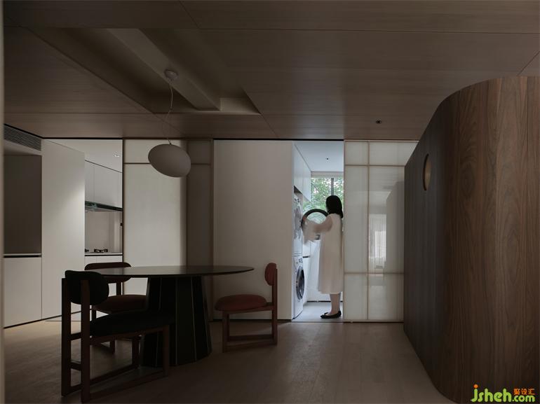It is unnecessary to deliberately create a difference. The light naturally enters the middle of the room through the hazy silk screen, and the gentler light reaches the living room through the top wood veneer and exposed beams, converging with the light from the direction of the balcony, slowly showing the rich appearance of the space where different materials converge.