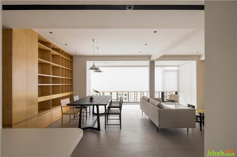 大平層裝修設(shè)計(jì)拆掉了離客廳最近且朝南的房間,調(diào)整布局通過(guò)客餐廳一體化的直觀,得到活動(dòng)動(dòng)線上的自由,主背景是木色的轉(zhuǎn)折、連續(xù),時(shí)隱時(shí)現(xiàn)成為整個(gè)空間面的涂底。