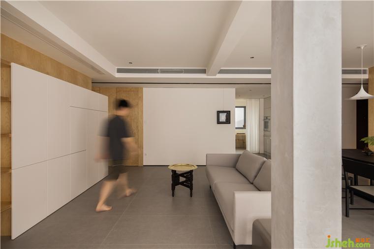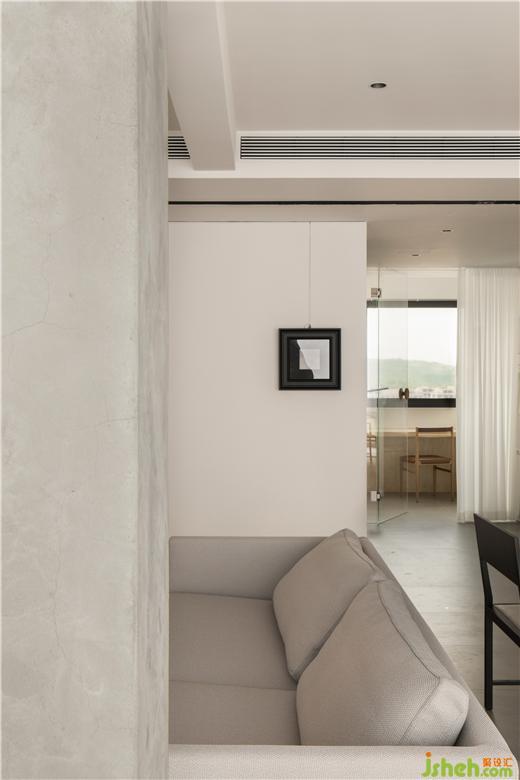 房間的非承重墻體被敲掉后,在公共空間留下了一根布滿細(xì)鋼筋的柱子,大平層裝修設(shè)計(jì)經(jīng)過(guò)粉飾之后意外的有了清水混凝土的效果,伶仃的柱子在這個(gè)地帶雖是樸素裸露的樣子,卻成為了室內(nèi)空間建筑感的來(lái)源。