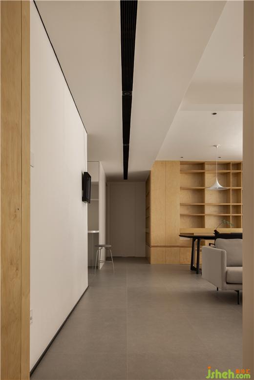 把入戶的玄關(guān)柜和客廳書柜統(tǒng)一起來(lái)做,兩個(gè)面的轉(zhuǎn)角在空間中產(chǎn)生一種視覺(jué)偏差,形成一個(gè)獨(dú)立個(gè)體的樣子。公共區(qū)域的主動(dòng)線由黑色的空調(diào)風(fēng)口牽引,這條黑線通過(guò)路線盡頭鏡面的二次反射,感官體驗(yàn)被無(wú)限的拉長(zhǎng),黑線在頭頂漸行漸隱,空間的末端變得小而朦朧。