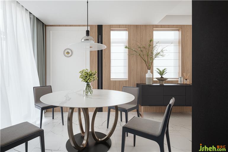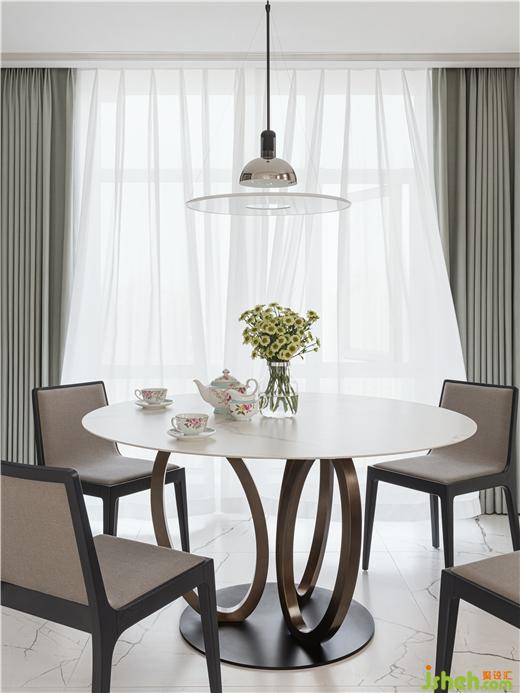 家裝設計在靠窗的位置選用金屬和大理石的圓形餐桌,