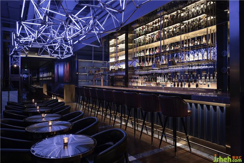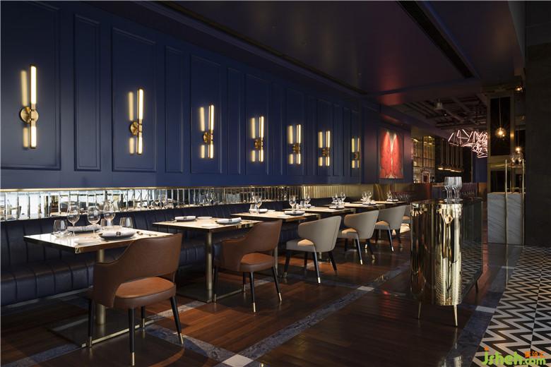 整個建筑呈長條形,近4米高的落地玻璃將黃浦江風景一覽無余,根據(jù)建筑形態(tài)把就餐區(qū)依條形布置,將廚房靠后,以此呈現(xiàn)出酒廊的基本空間形態(tài)。室內(nèi)設計師將300m2的酒廊劃分為餐區(qū)、酒吧、廊吧、廚房四大區(qū)域,以藍色為主基調(diào)將幾個區(qū)域連成一體。
